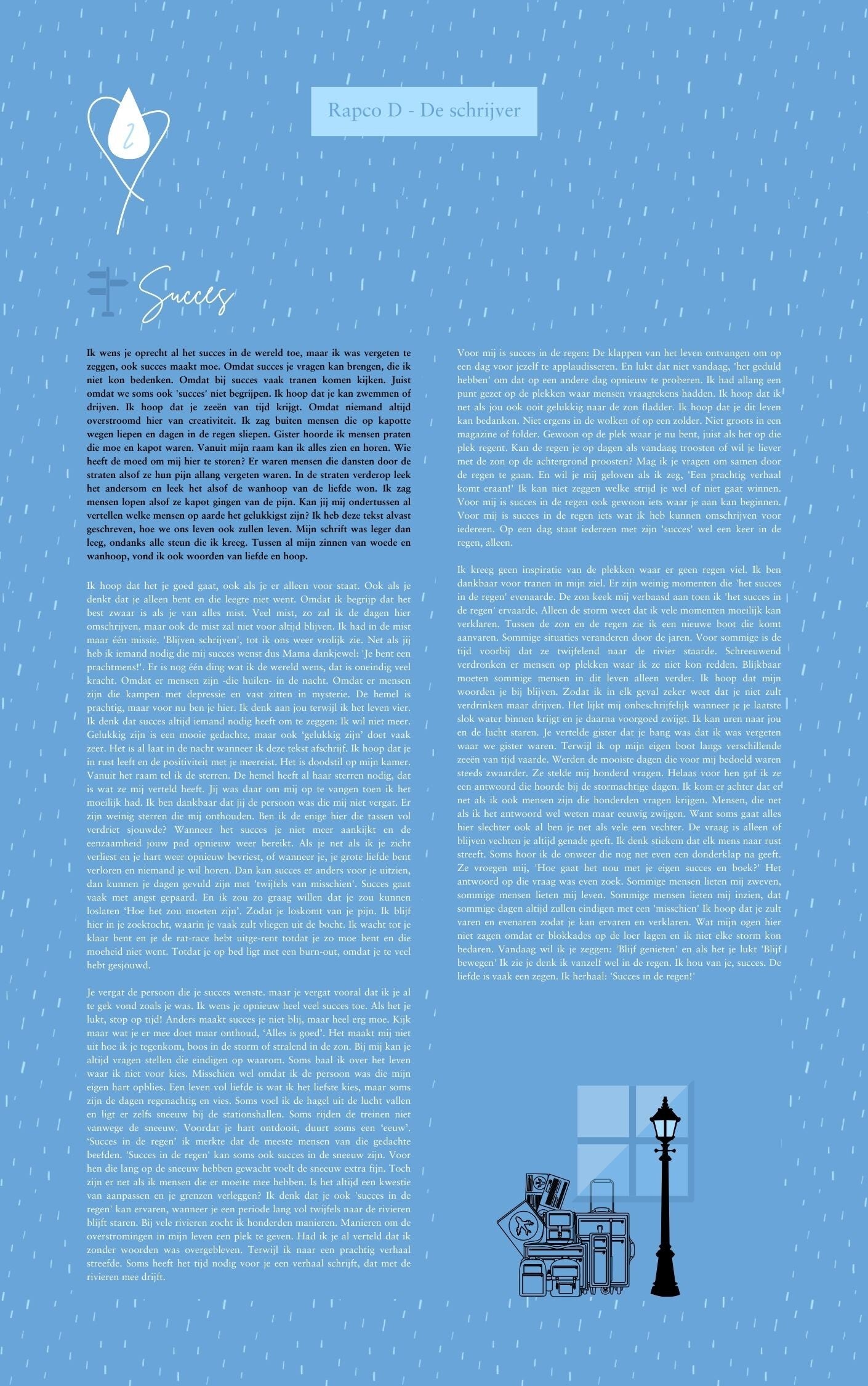 Je kunt mijn boek bestellen vanaf Januari 2025. Je kunt dan ook meteen het omslagboekje,'Succes in de regen bestellen' Ik schreef dit boek voor alle mensen die vastzitten in de regen. Er zijn regenbuien die je niemand toewenst in dit leven. Ik kon geen ruitenwissers vinden die het verleden voor ons wissen. Huilend en kruipend onderweg naar succes zal ik je liefde missen. Ik weet niet of ik al mijn spullen nodig zal hebben onderweg naar succes. Ik weet niet of 'succes' de nooduitgang is van alle stress. Kan jij de liefde vertellen, ik ben onderweg. Zou je haar ook meteen iets kunnen vragen, over regen en pech. Voor mij is succes in de regen: De klappen van het leven ontvangen om op een dag voor jezelf te applaudisseren. En lukt dat niet vandaag het geduld te hebben om dat op een ander moment opnieuw te proberen. Ik wenst je de titel van mijn boek toe, maar maakt het leven je nou echt moe… dan hoopt ik dat je het boek opnieuw opent. Juist wanneer het in je leven opnieuw weer keihard regent.